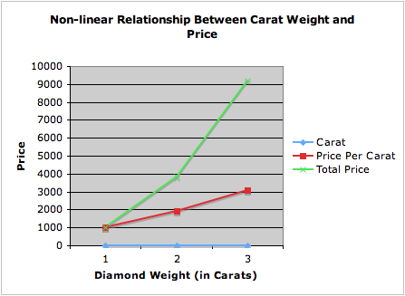Consider several diamonds with color D (highest grade) and clarity IF (highest grade), varying by weight. If we imagine a per carat price of $1000 (purely for illustration and easy math!) we see the following price trend.